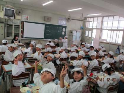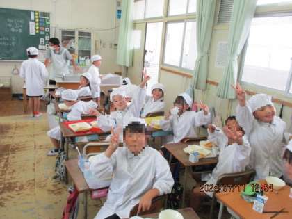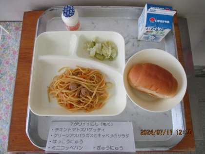 今日の給食は、ミニコッペパン、牛乳、チキントマトスパゲッティ、グリーンアスパラガスとキャベツのサラダ、発酵乳です。