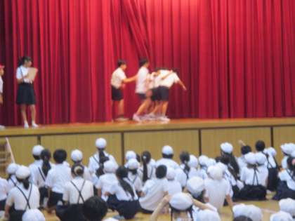 幕の間を集会委員会が通っていきます。その人数をたてわりのペアで答えます。答え方は1番なら「手をつないで立つ」。2番なら「手をつないで背中合わせで立つ」。3番なら「下級生が上級生の肩に手を置く」。
