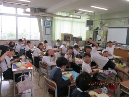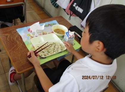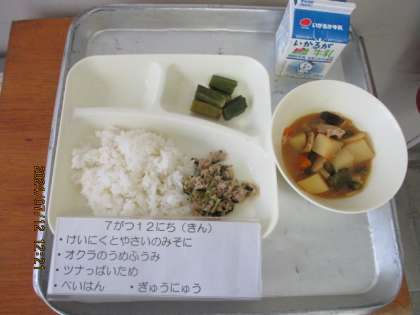 今日の給食は、ごはん、牛乳、鶏肉と野菜のみそ煮、オクラの梅風味、ツナっ葉いためです。