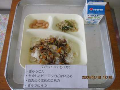 今日の給食は、牛丼、牛乳、もやしとピーマンのごまいため、大福豆の煮ものです。