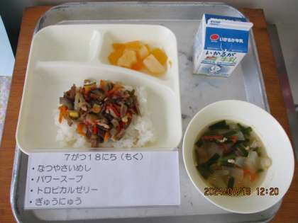 今日の給食は、夏野菜飯、牛乳、パワースープ、トロピカルゼリーです。