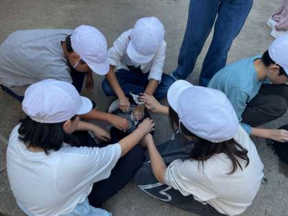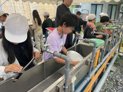 グループで協力し合っての片付けです。「使う前より美しく!」。このあとの活動がゆとりを持ってできるように、フルパワーで洗ってます。