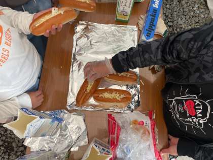 パンにソーセージ、キャベツ、チーズをはさみます。アルミホイルの一重目は食材をピッタリ包み、二重目は空気の層ができるように包むのがコツです。