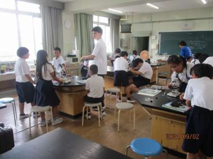 教育実習生も、子どもたちに顕微鏡の使い方について、優しく子どもたちに声掛けしていました。