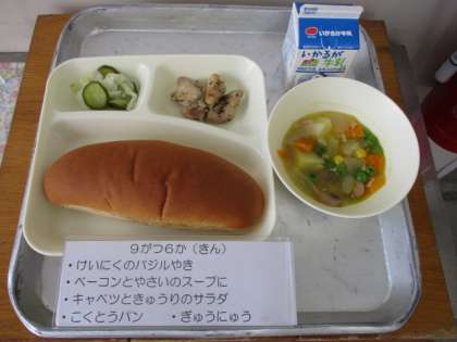 今日の給食は、黒糖パン、牛乳、鶏肉のバジル焼き、ベーコンと野菜のスープ煮、キャベツときゅうりのサラダです。