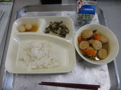 今日の給食は「月見」の行事献立。ごはん、牛乳、一口がんもとさといものみそ煮、牛肉と野菜のいためもの、みたらしだんごです。