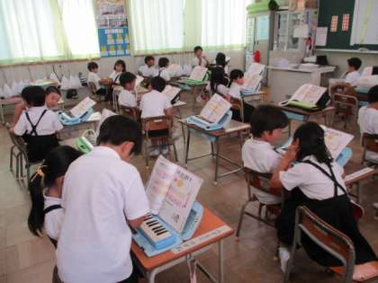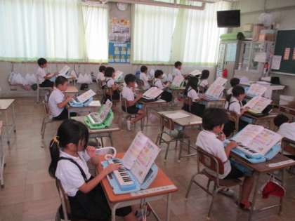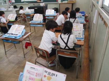 1年生が鍵盤ハーモニカの練習をしています。全員で練習したあと、半分の子が弾いて、半分の子が弾けているかどうかを見ていました。楽しそうに上手に演奏していました。