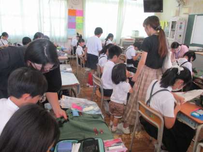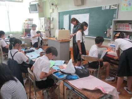 模様のデザインやミシンの操作など、お家の方にも手伝ってもらいながら、自分だけのエプロンを作りました。このほほえましい光景は小学校だからこそ見られるように思えます。