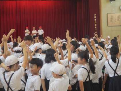 2学期はじめの児童集会。今日も集会委員が進行してのゲームです。「船長さんの命令です。右手をあげましょう」。指示をよく聞いて、動くべきか動かないべきか。みんなでやると楽しいですね。