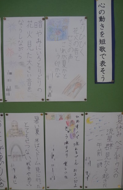 中央階段掲示板に子どもたちのすてきな歌が掲示されています。夏休みなどでの心の動きを表現しています。どの歌もほっこりとさせられますね。