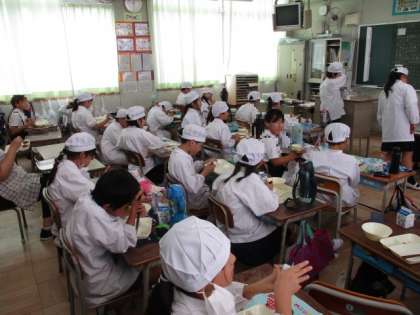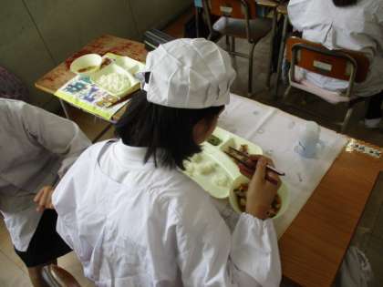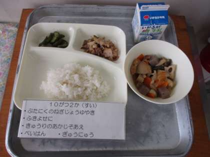 今日の給食は、ごはん、牛乳、豚肉のねぎじょうゆ焼き、ふきよせ煮、きゅうりの赤じそあえです。
