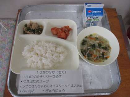 今日の給食は、ごはん、牛乳、鶏肉のチリソース焼き、焼き豚のスープ、ツナとさんどまめのオイスターソースいためです。