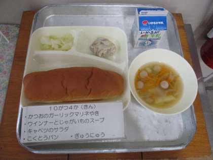 今日の給食は、黒糖パン、牛乳、かつおのガーリックマリネ焼き、ウインナーとじゃがいものスープ、キャベツのサラダです。