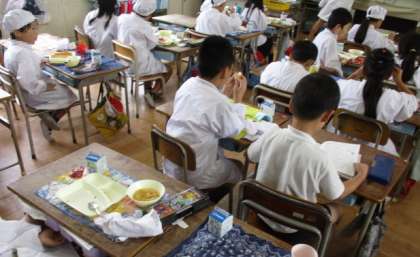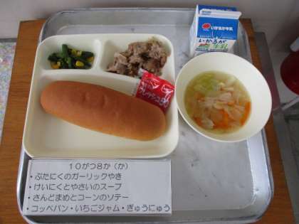 今日の給食は、コッペパン、牛乳、豚肉のガーリック焼き、鶏肉と野菜のスープ、さんどまめとコーンのソテー、いちごジャムです。