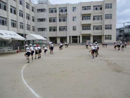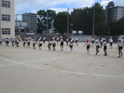 これまで講堂で練習してきた団体演技。今日は運動場に出て、演技する場所や隊形移動について確認しました。涼しくなってきて、練習しやすい時間でした。