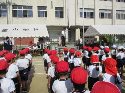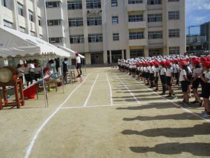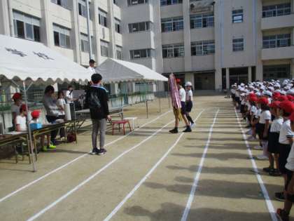 第1回目の運動会全体練習を行いました。今日は、入場、開会式、応援団の練習です。入場は、赤白1列ずつで運動場に整列します。赤白応援団長による優勝旗・準優勝カップ返還や誓いの言葉も行いました。