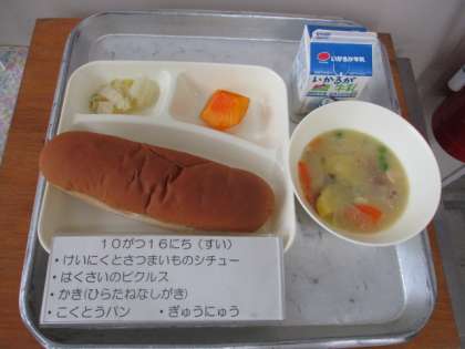 今日の給食は、黒糖パン、牛乳、鶏肉とさつまいものシチュー、はくさいのピクルス、かき(平核無柿)です。