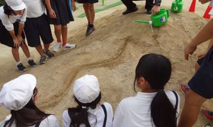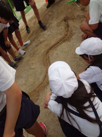運動場の土山を使って、流れる水の働きについて実験し、観察しました。水の曲がりの外側が削られていることや、上流は流れの幅が狭く、底が深いこと。下流は流れの幅が広がり底が浅いことなど、気づいたことを発表し合いました。