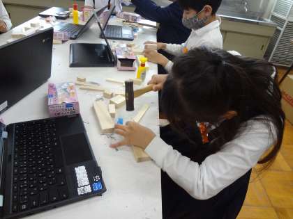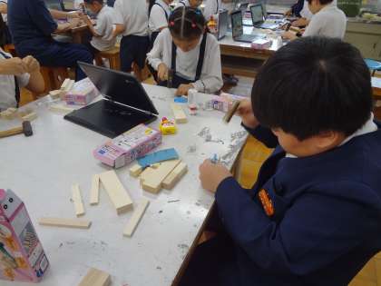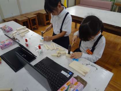 はじめての金づちを使った木工に取り組みました。釘をまっすぐに木に打つのは、なかなか難しいですが、何度もチャレンジしながら、コツをつかんでほしいと思います。