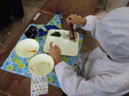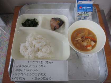 今日の給食は、ごはん、牛乳、なまりぶしのしょうが煮、なめこのみそ汁、ほうれんそうのごまあえです。