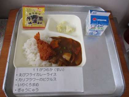 今日の給食は、えびフライカレーライス、牛乳、カリフラワーのピクルス、いり黒豆です。