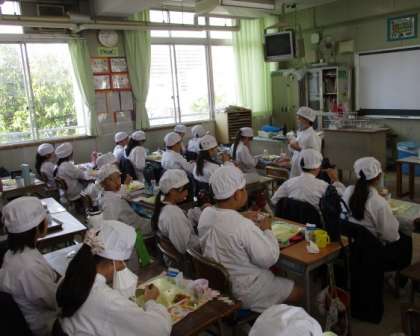 今日は、普段より少し豪華なエビフライがのったカレーライスが登場しました。給食を取りに来た児童たちは、サンプルを見るなり大喜び!