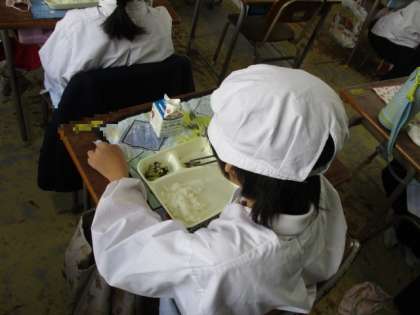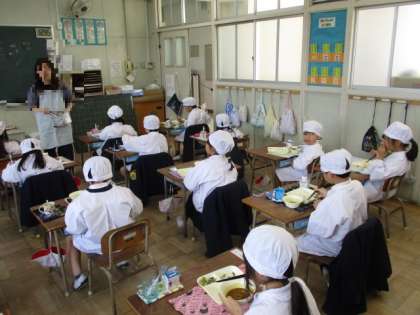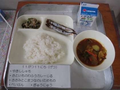 今日の給食は、ごはん、牛乳、焼きししゃも、さといもの和風カレー汁、ささみとこまつなのいためものです。