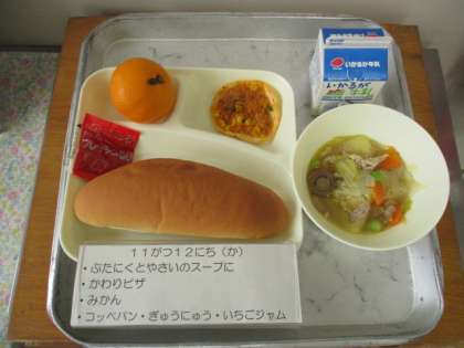今日の給食は、コッペパン、牛乳、豚肉と野菜のスープ煮、変わりピザ、みかん、いちごジャムです。