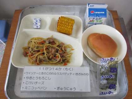 今日の給食は、ミニコッペパン、牛乳、ウインナーときのこの和風スパゲッティ(きざみのり)、焼きとうもろこし、固形チーズです。