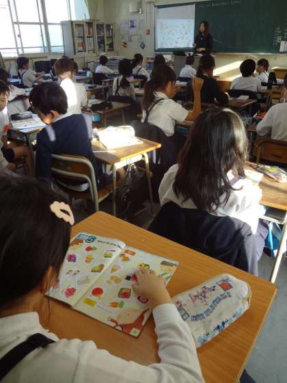 教科書にある絵の中から自分の好きなものを選んだり、相手に尋ねたり。おはじきを使ったアクティビティで楽しみにながら学びました。