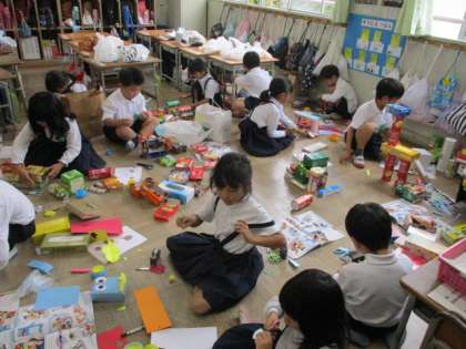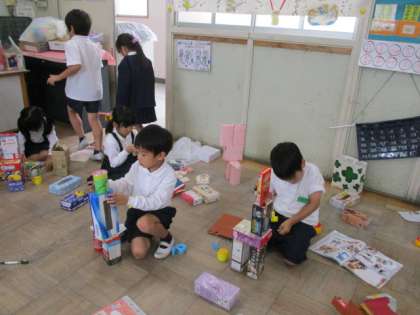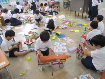 1年生が「はこ」をつかって生き物を作っています。つんだり、ならべたり、くっつけたり、黙々と取り組んでいました。どんな生き物たちができるでしょう。