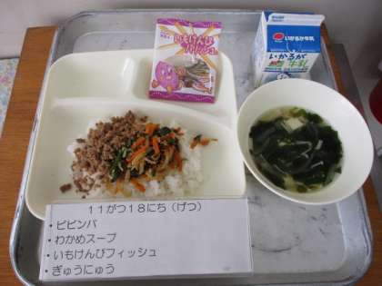 今日の給食は、ビビンバ、牛乳、わかめスープ、いもけんぴフィッシュです。
