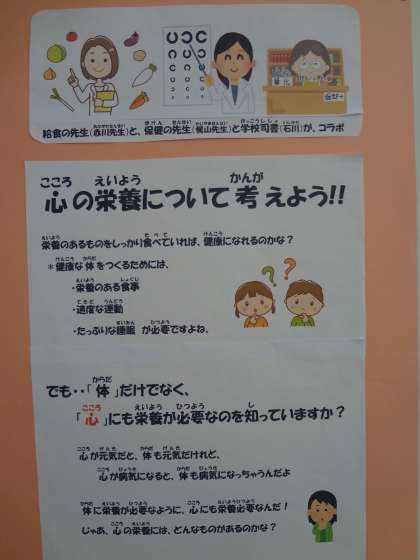 保健の先生・給食の先生・学校司書さんがコラボした「心の栄養について考えよう」コーナー。「心の栄養」についてのみんなで考えたり、ヒントになる本を読んでみたりするといいですね。