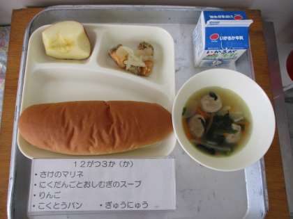 今日の給食は、黒糖パン、牛乳、さけのマリネ、肉だんごと押麦のスープ、りんごです。