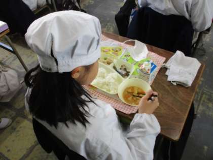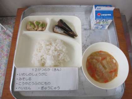 今日の給食は、ごはん、牛乳、いわしのしょうが煮、みそ汁、高野どうふの煮ものです。