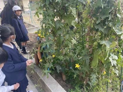 2年生の子どもたちが4年生の学習園で、ヘチマの実を見ていました。「この実の名前はなに?」と尋ねたら「キュウリ!」とのこと。このあとも実の成長に興味をもってほしかったので、「そうなんや。これから、もっとキュウリらしくなるのか、楽しみやね。」と伝え、「ヘチマ」とは答えませんでした。