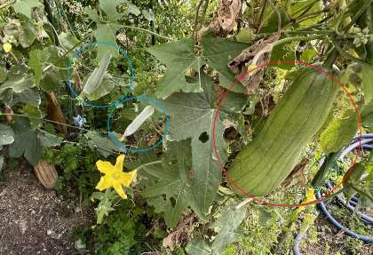 写真2枚目の青い丸の中の実は大きさが違うけれど同じ実だと話す子どもたち。でも赤い丸の中の実は、青い丸の中の実とは違うって考えている子どもたち。実の成長を見届けたときの子どもたちの反応や4年生の理科でヘチマを育てる時が楽しみです。