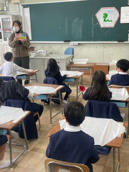 日本の伝統文化の一つであるたこあげ。日本の年中行事、伝統文化に触れて、風に舞うたこの糸を引くときの手ごたえなどを経験する機会を授業の一環で行います。たこのデザインは、先生の見本から発想するのですが、先生の描いたかわいらしいへびを見た子どもの多くが、「先生のかいたかわいいたこをかきたい。」ということで・・・たくさんのかわいいへびのたこが揚がりそうです。実際にたこあげする時が待ち遠しい子どもたちです。