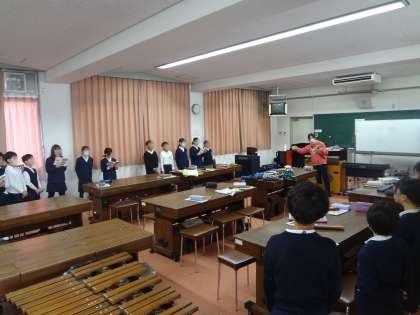 歌「絆」をパートごとに分かれて、合唱します。お互い向かい合って、相手の音を感じながら響かせていきます。美しいハーモニーが聞こえてきました。