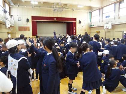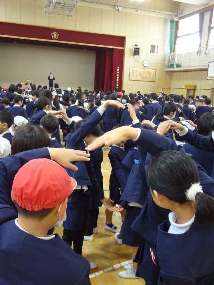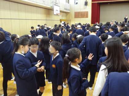 姫里小学校に関係する○×クイズが行われました。たてわりのペアで相談して、二人で協力し合って○や×を作って答えます。単なる○×クイズでなく、このような答えの示し方を工夫することが、相手に寄り添って活動する経験を積むことにつながります。