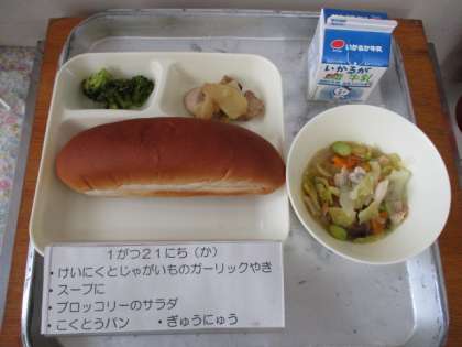 今日の給食は、黒糖パン、牛乳、鶏肉とじゃがいものガーリック焼き、スープ煮、ブロッコリーのサラダです。