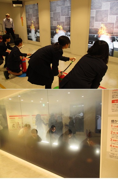 消火器を使って映像の炎を消す「消火体験」や煙の中を低くなって進む「煙体験」をしました。