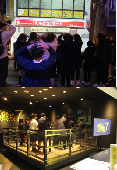 地震直後の街では、「上から物が降ってくるので、両手で頭をまもる」という説明に、子どもたちは必死に頭を守っていました。