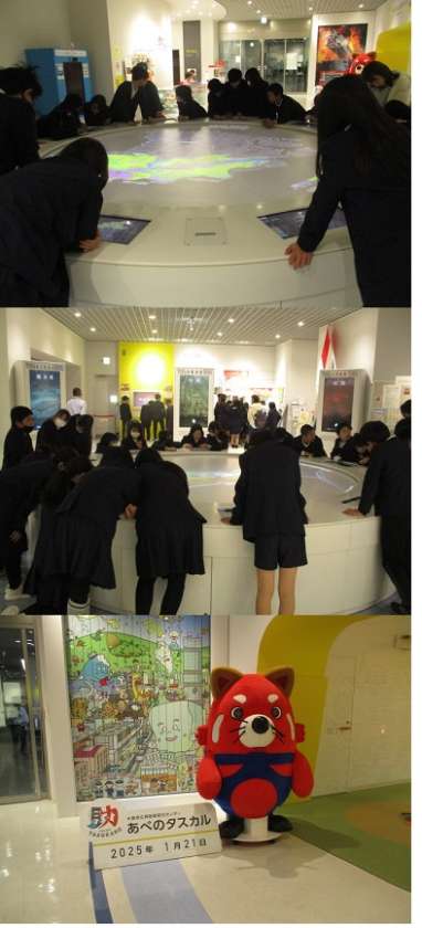 震度7の体験では、阪神淡路大震災や、今後起こるとされている南海トラフ地震での揺れや映像から、地震の怖さを学びました。大阪市全域の地図を見ながら、南海トラフ地震が起きたときの津波や液状化など被害の予想状況の説明を聞きました。