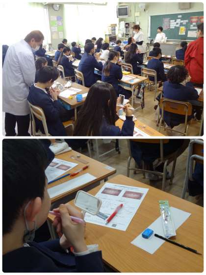 学校医さん、歯科衛生士さんが来校していただき、特別授業を行っていただきました。食物の消化には、しっかりと噛むことや歯や唾液の役割りが重要であることを始めに学びました。健康な歯や歯茎の様子、生活習慣と大きく関係する歯周病についても学びました。最後に、歯の磨き、前後の口内の変化をとらえ、歯を磨くことの大切さにあらためて気づきました。健康な体を保つことや、勉強・スポーツにも歯は大切ですね。