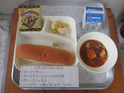今日の給食は、コッペパン、牛乳、ビーフシチュー、カリフラワーとコーンのサラダ、カレーフィッシュ、バターです。