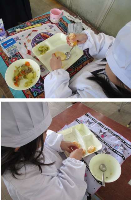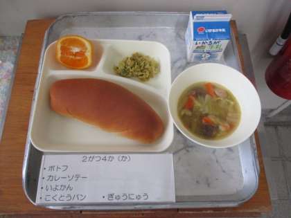 今日の給食は、黒糖パン、牛乳、ポトフ、カレーソテー、いよかんです。