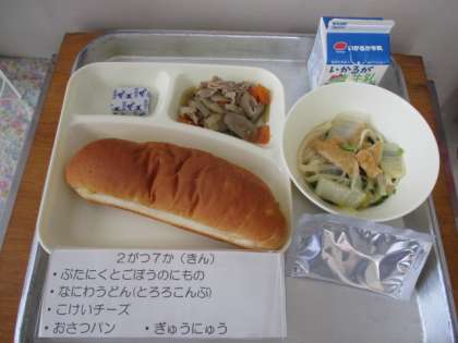今日の給食は、おさつパン、牛乳、豚肉とごぼうの煮もの、なにわうどん(とろろこんぶ)、固形チーズです。