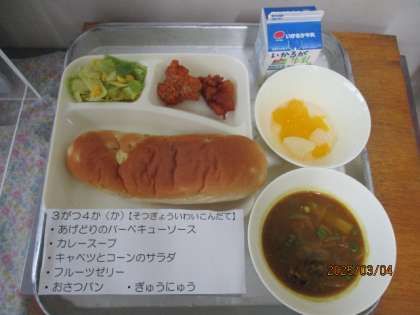 今日の給食は、おさつパン、牛乳、あげどりのバーベキューソース、カレースープ、キャベツとコーンのサラダ、フルーツゼリーです。