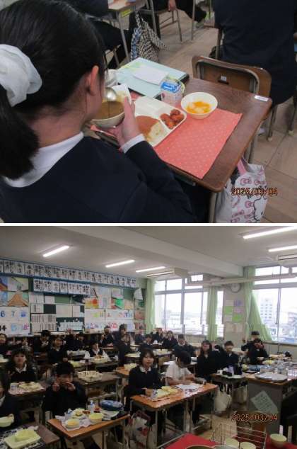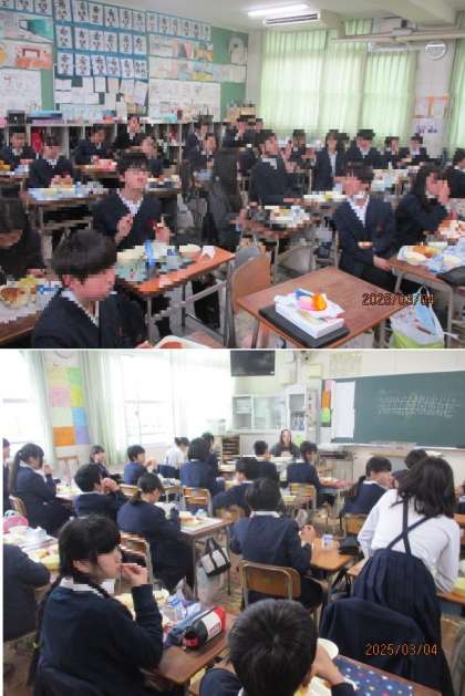 今日は、「卒業祝い献立」でした。6年生の卒業を祝い、普段よりも豪華な献立になっています。6年生の教室に入ると、「とても豪華!食べるの楽しみ」「卒業する実感がまだないな」という声が。少し寂しい気持ちもありながら、みんなおいしそうに食べていました♪